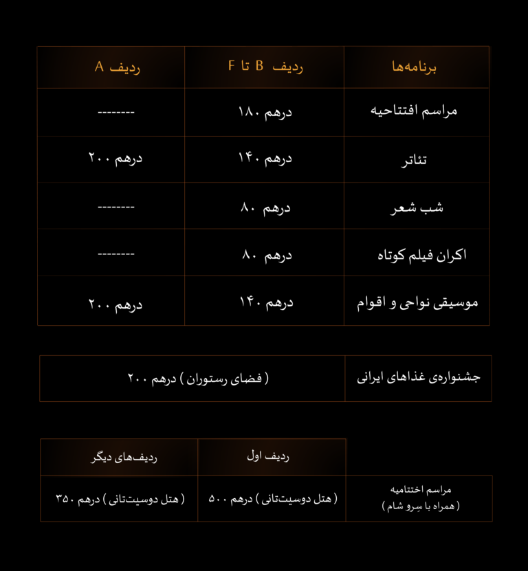 در جدول زیر میتوانید قیمت بلیط های هر شب را مشاهده کنید